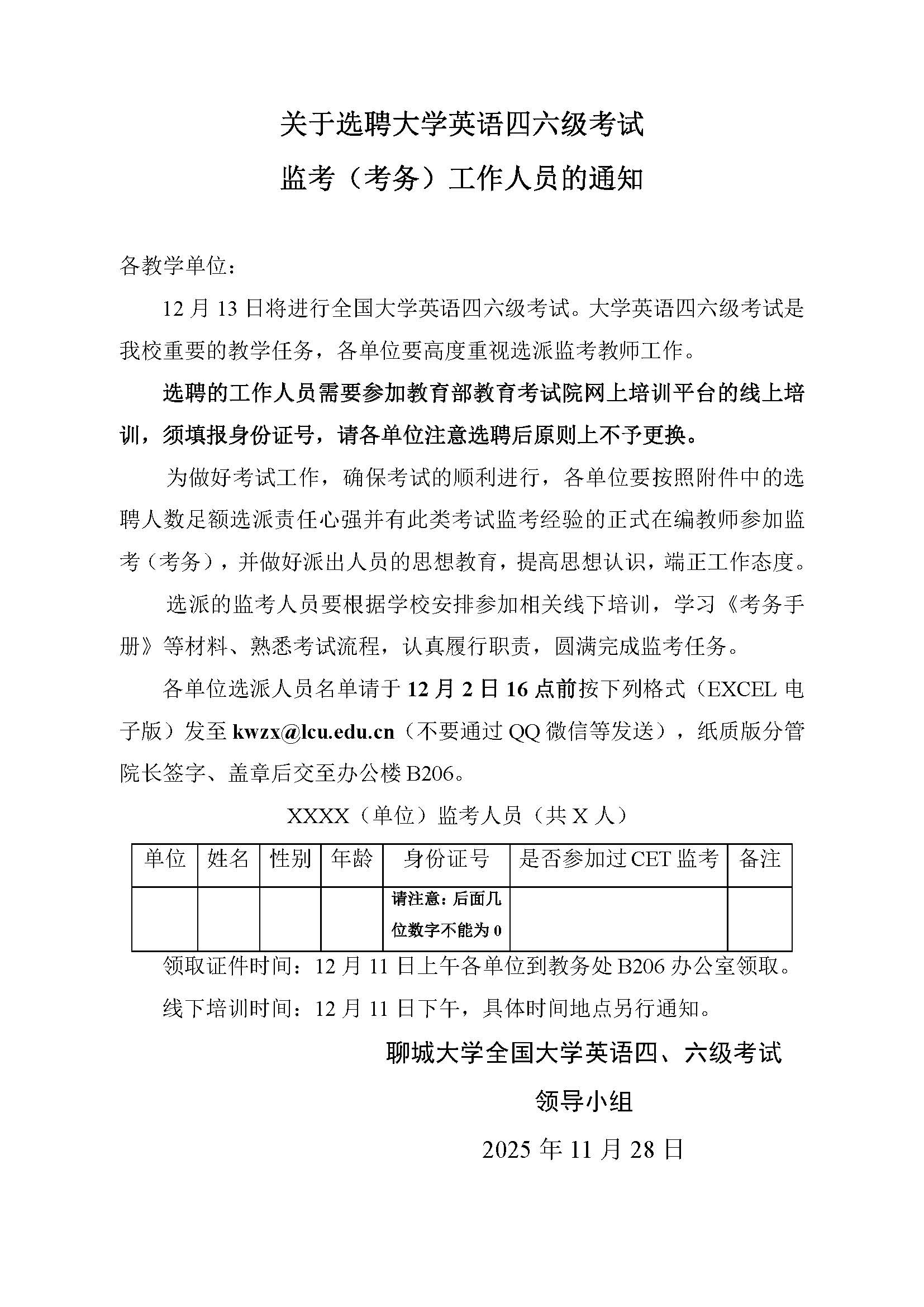 关于选聘大学英语四六级考试监考、考务工作人员的通知