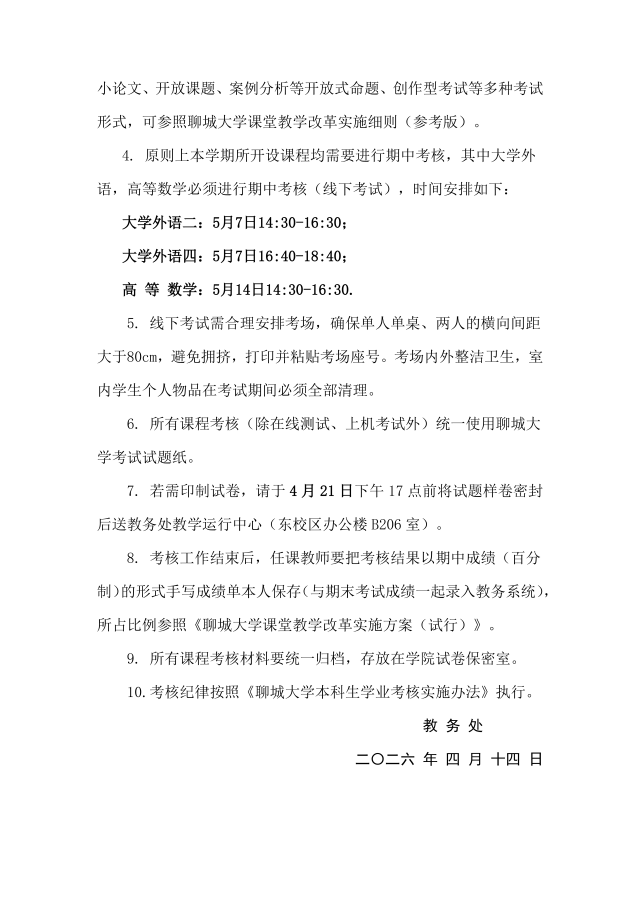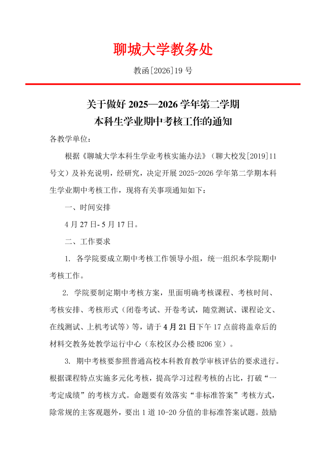关于做好 2025—2026 学年第二学期本科生学业期中考核工作的通知
