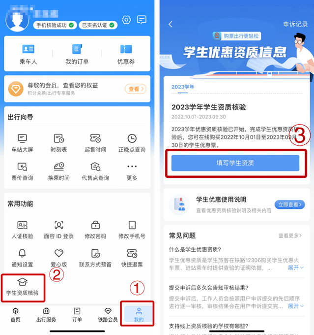 关于2025级本科新生在线核验火车票优惠资质的通知 根据《教育部办公厅 国铁集团办公厅关于进一步便利普通高等学校学生购买优惠火车票的通知》(教学厅函〔2023〕4号)精神,现将本科新生在线核验火车票优惠资质及学生证乘车区间填写要求等有关事项通知如下: 一、学生证乘车区间填写要求 各学院组织申请火车票优惠资质的学生填写《新生火车票优惠资质乘车区间统计表》(附件1,学院留存)、填写学生证家庭所在地及乘车区间,学生乘车区间应为学校所在地至家庭所在地,或父母实际居住地,学校所在地火车站填“聊城”,家庭所在地车站需按铁道购票部门规定标准的车站名称填写(以铁道部12306网站查询的站名为准),学院审核学生填报信息无误后,在学生证乘车区间页加盖学院公章。 二、在线优惠资质核验 学生在“铁路12306”APP学生专区填写个人信息及乘车区间,用于学生优惠资质核验;《新生火车票优惠资质乘车区间统计表》、学生证、“铁路12306”APP三处填写的乘车区间必须一致。 三、“铁路12306”APP学生专区填报指南 第1步:学生登录铁路12306手机客户端,右下角“我的”页面中点击“学生优惠资质核验”专区。如果当前用户是“已注册会员”或“已经在本机完成了人脸认证”则可直接点击“填写学生资质”核验学生资质信息。 第2步:根据学生证信息如实填写学校所在地车站、家庭所在地车站(申请时准确填写个人信息和与学生证上一致的优惠乘车区间!)、预计毕业年份等信息后,点击提交。提交学生资质信息后,若信息与学信网相匹配,后台将于3天内自动审核通过。 教 务 处 2025年9月17日 教育部办公厅 国铁集团办公厅关于进一步便利普通高等学校学生购买优惠火车票的通知 //www.moe.gov.cn/srcsite/A15/s7063/202306/t20230605_1062839.html
