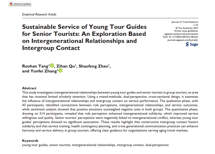 教师唐若菡博士、赵少峰教授、张云飞博士,以及旅游管理专业的本科生曲子涵共同构成。 《Journal of Travel Research》是JCR分区Q1期刊,同时入选中国科学院文献情报中心管理类一区TOP期刊,亦为ABS四星期刊,最新影响因子为8.5。该期刊长期关注并发表旅游行为学、旅游目的地管理、旅游经济、旅游可持续发展、游客满意度,以及旅游大数据与数字化创新等前沿领域的原创性研究成果,致力于推动全球旅游学科的理论发展与实证研究进步,是国际旅游学界公认的重要权威期刊之一。 本研究聚焦团体旅游中年轻导游与老年游客的代际关系这一学界关注较少的领域,采用混合研究方法、双视角的横断面设计,探究代际关系与群际接触对服务绩效的影响。在涉及43名参与者的定性阶段,研究明确了角色感知、代际关系与服务结果之间的关联。同时,情绪分析显示两类群体的积极情绪均多于消极情绪。在基于514名参与者的定量阶段,研究发现角色感知可增强代际团结,从而提升服务意愿与服务质量。老年游客的感知与代际冲突呈负相关,而年轻导游的感知则与代际冲突无显著关联。研究结果强调,积极的群体间接触有助于促进代际团结,针对导游的服务培训、健康应急预案设计以及跨代沟通策略,能够有效提升团体旅游中的服务协调性与游客满意度,为应对老龄化旅游市场提供了切实可行的管理启示。 此次成果的发表是科研团队旅居养老服务研究领域的重要进展。研究的顺利完成得益于师生协作、跨学段联合培养的有效模式,体现出学院在科研组织、学术训练和青年人才培育方面的良好基础。为开展相关科研项目和拓展专业建设方向奠定扎实的学术支撑。未来,团队将继续聚焦旅居福祉和老龄社会服务领域开展高质量研究,形成更多具有学术影响力和社会意义的成果,助力旅游管理学科发展。