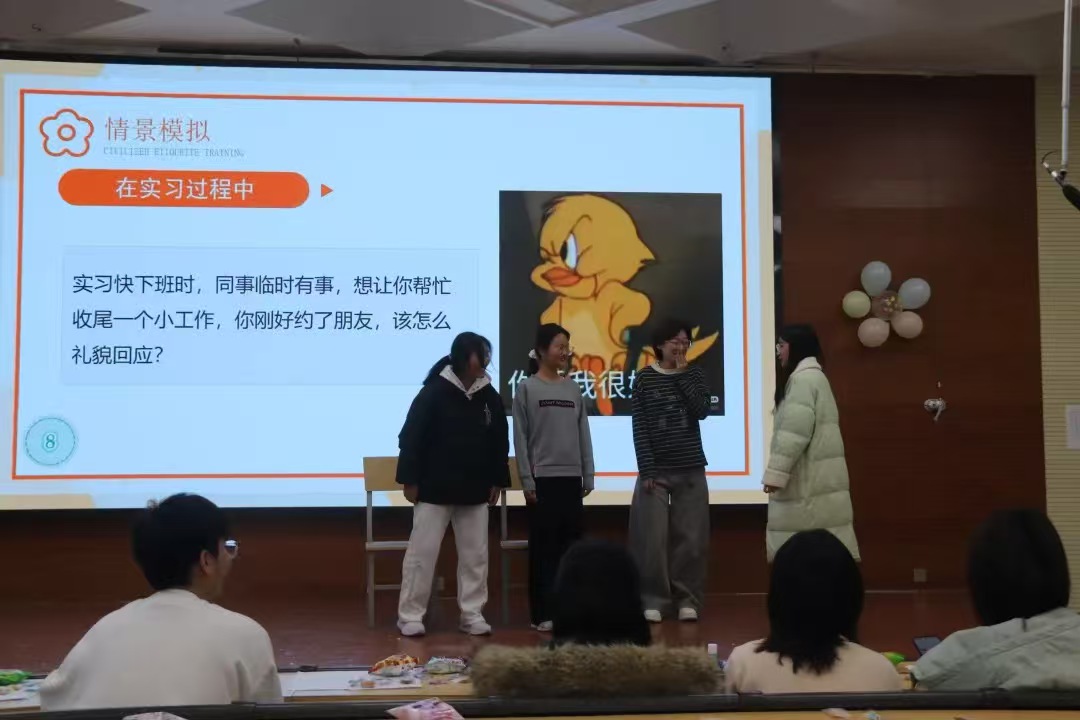 于6#A106报告厅举办“礼承千年风,仪展今朝韵”礼仪大赛。 比赛现场,选手们以中华礼仪文化为核心,通过礼仪展示、情景模拟、礼仪知识竞答三个环节展开精彩角逐,充分展现传统礼仪的深厚底蕴与当代青年的礼仪风采。 在礼仪展示环节,伴随着轻快舒缓的音乐缓缓流淌,选手们仪态端庄,动作规范标准,逐一呈现了站姿、坐姿、问候、指引等各类基础礼仪动作,尽显优雅风范与良好素养,生动诠释礼仪文化的精神内核。 在情景模拟环节中,各小组随机抽取社交礼仪情境并即兴演绎,借助现场道具,以鲜活情景剧的形式还原多样社交场景。选手们凭借自然真挚的演绎,将礼仪应用技巧巧妙融入剧情之中,既展现了扎实的礼仪实践能力,现场氛围欢快融洽。现场氛围轻松融洽,赢得阵阵掌声。 中场休息环节,精彩节目轮番上演。张诺带来电吉他音乐《再见杰克》,激昂的旋律伴着强劲节奏直击人心,奏响了独属于青春的热血之声。闵令辉带来歌曲《官窑》,动感十足的节奏搭配流畅自然的韵脚,歌声极具感染力,瞬间点燃现场热烈氛围,为比赛增添了青春活力。 知识问答环节考验选手的礼仪知识储备,各小组抽取一名代表上台进行答题。面对各类礼仪相关题目,选手们反应敏捷、应答精准,充分展现了对传统知识与文化内涵的深刻理解,为观众呈现了一场精彩刺激的知识比拼。 经过多轮激烈角逐,评委团结合选手综合表现现场评分,最终第三代表队斩获一等奖,第一代表队荣获二等奖,第六代表队夺得三等奖。 本次活动的顺利举办,不仅为同学们搭建了一个学习礼仪知识、展示礼仪风采的平台,助力同学们涵养品德修为,提升处事能力,更进一步浓厚了校园崇礼尚礼的良好氛围,为校园精神文明建设注入蓬勃活力。 (供稿:刘乘希 摄影:刘乘希 初审:黄博雨 复审:魏志鹏 终审:尤姗姗)