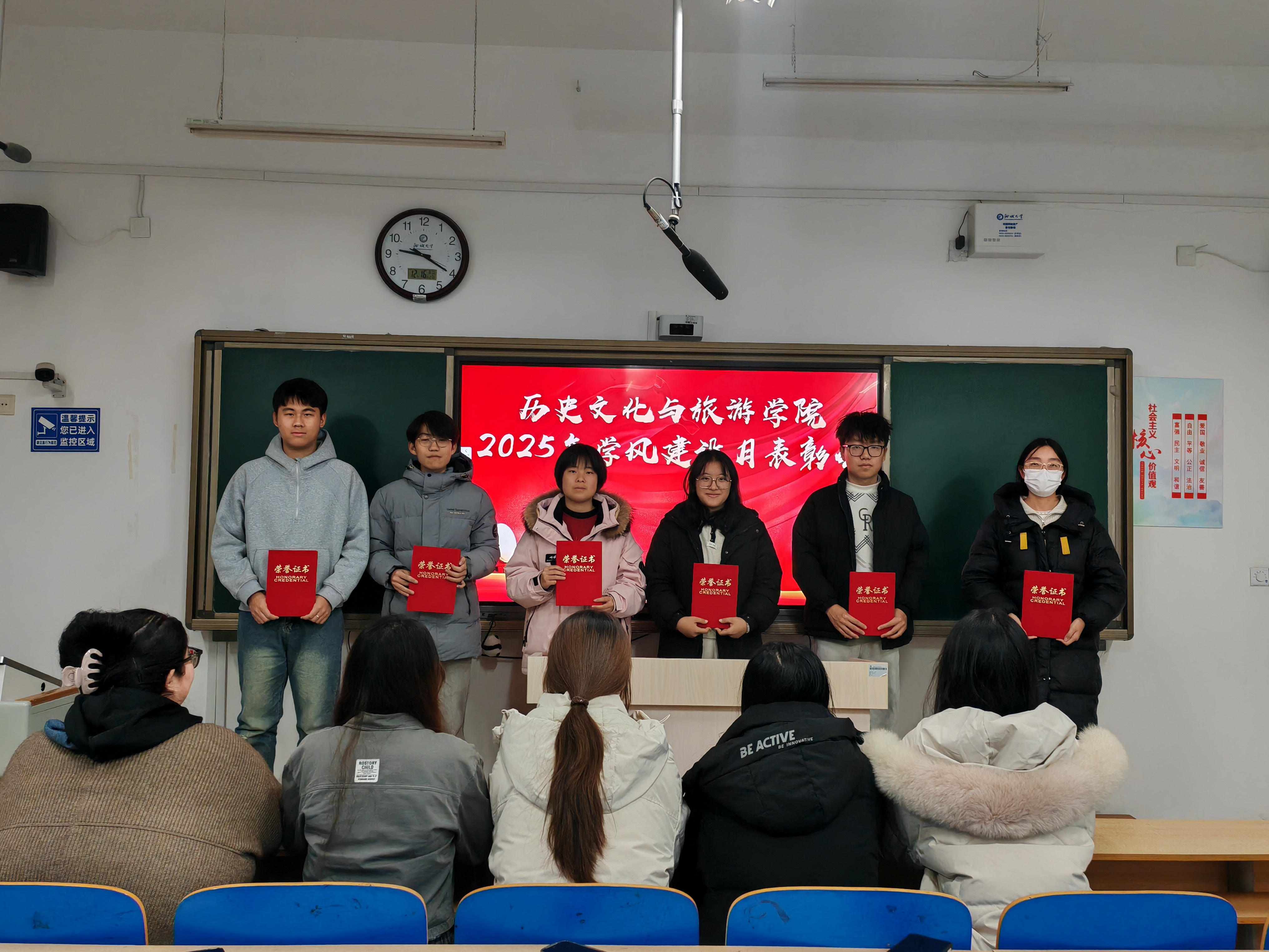 于6#A305教室召开2025年学风建设月表彰会。 会上,学院负责人全面复盘学风建设月系列举措:依托“历史经典研读”“文旅实践赋能课堂”等特色载体,开展专题讲座、学习互助小组、书香班级活动、学科竞赛等多元活动,覆盖全院学生;创新推行“学风成长档案”动态管理机制,通过量化学习行为、跟踪学业进度,实现学风建设从“粗放引导”到“精准施策”的转变,学生课堂出勤率、学业达标率较往期显著提升。 会议对学风建设月中表现突出的优秀班级、优秀个人予以表彰,获奖代表分享了班级学风建设经验与个人学习方法,展现了学院学子勤学善思、笃行实干的精神风貌。 学院负责人在总结中提出未来规划:持续深化“课堂—社团—实践”三位一体学风建设体系,打造“一专业一特色”学风品牌;完善学风建设长效机制,将表彰激励与过程培养相结合,鼓励学生以榜样为镜,在学史研途中筑牢专业根基,以实干践行青春使命。 此次表彰会既是对学风建设月成果的集中展示,更是学院推进学风建设常态化、特色化的重要节点,为营造勤学笃实、创新争先的育人氛围注入新动力。