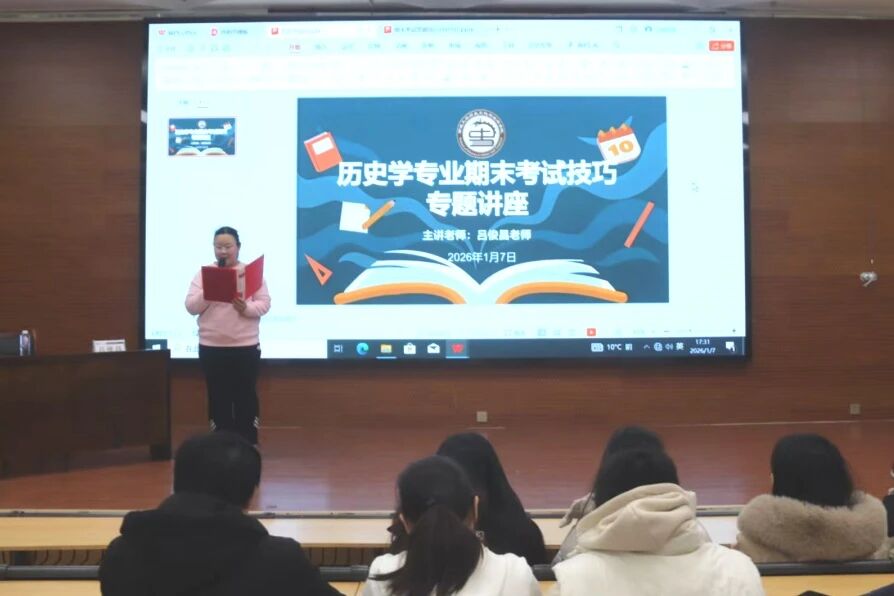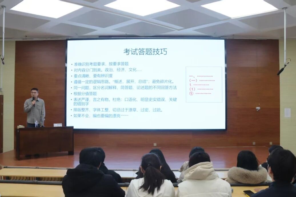 历史系主任吕俊昌担任主讲人。 技巧讲解环节,吕俊昌围绕考试答题的核心要点展开系统阐释,强调答题需保证要点清晰、逻辑连贯,依据分值把控作答篇幅。针对名词解释、简答题、论述题等不同题型,吕俊昌讲解差异化作答方法,提醒学生规避口语化表述、史实错误、错别字等常见问题,为学生构建起完整的应试技巧体系。 案例分析环节中,吕俊昌结合往届学生试卷实例,直观剖析答题中的得分要点与失分原因。针对试卷中普遍存在的作答问题,吕俊昌逐一解读并总结出适合历史学专业的答题方法,让学生对考试答题的实操要求形成深刻认知,有效化解备考过程中对答题技巧的困惑。活动最后,吕俊昌向在场学生提出具体学习要求,鼓励学生以严谨态度开展期末复习,将所学答题技巧运用到实际备考中,扎实巩固基础知识,以良好状态迎接期末考试,争取取得良好成绩。 此次专题讲座的顺利举办,不仅有利于帮助学生厘清应试思路,掌握实用的考试技巧,而且有利于营造积极有序的备考氛围,推动整体学业水平的提升。下一步,学院将会持续开展此类专题讲座活动,为学生学习发展提供有力支持,助力学生达成阶段性学习目标。 (供稿:张旭 郭艺泽 摄影:张旭 郭艺泽 初审:郭艺泽 复审:宋佳珊 终审:尤姗姗)