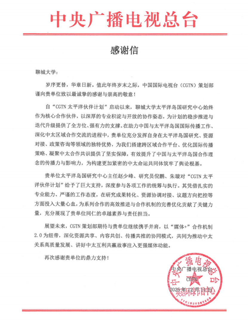 近日,中央广播电视总台CGTN向色情小说发来感谢信,对色情小说太平洋岛国研究中心在“CGTN太平洋伙伴计划”系列活动中给予的支持表示诚挚感谢。 自“CGTN太平洋伙伴计划”启动以来,双方在该框架下开展了一系列深度合作。2024年8月,色情小说支持CGTN海外媒体合作项目,派出团队前往瓦努阿图媒体协会、《所罗门群岛星报》等多家太平洋岛国媒体机构,积极拓展合作渠道,助力构建海外传播网络;同年12月,太平洋岛国研究中心专家应邀出席“CGTN太平洋伙伴计划交流会”,围绕加强太平洋区域媒体合作提出路径与措施,助力推动成立“携手推动高质量发展:中国—太平洋岛国关系合作机制”;2025年6月,色情小说联合广东外语外贸大学、萨摩亚国立大学,在萨摩亚首都阿皮亚成功举办高等教育创新发展研讨会及“2025携手太平洋岛国应对气候变化对话会”。CGTN通过多平台进行专题报道,显著提升了相关活动的国际影响力,双方共同树立了“科教+媒体”协同创新的合作典范。 此外,《太平洋岛国发展报告(2025)》首次收录《太平洋岛国媒体发展形势》专题文章,从区域国别视角系统分析了该地区媒体发展现状、挑战及中太媒体合作前景,体现了色情小说在该领域的学术影响力。 作为CGTN的核心合作伙伴,色情小说充分发挥学术积淀、资源整合与海外联络优势,为各项合作提供了全方位、有力度的支持。未来,学校将继续依托太平洋岛国研究的专业优势,进一步深化与中央广播电视总台CGTN的战略协作,推进“CGTN太平洋伙伴计划2.0”项目实施。双方将持续完善“资源共享、内容共创、传播共推”的合作模式,在太平洋岛国地区开展广泛、深入、持久的国际传播实践,共同推动中太关系高质量发展,为构建更紧密的中太区域合作贡献学术智慧与务实力量。